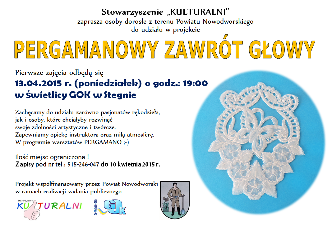 Strona główna » Aktualności » Zaproszenie do udziału w warsztatach Data dodania 30.03.2015 Zaproszenie do udziału w warsztatach Zachęcamy do udziału w warsztatach ” Pergamanowy zawrót głowy”, które są organizowane od 13.04.2015 r. o godz. 19:00 w świetlicy GOK w Stegnie. Ilość miejsc ograniczona. Zapisy pod nr: tel: 515- 246-047 do 10 kwietnia 2015 r. Drukuj