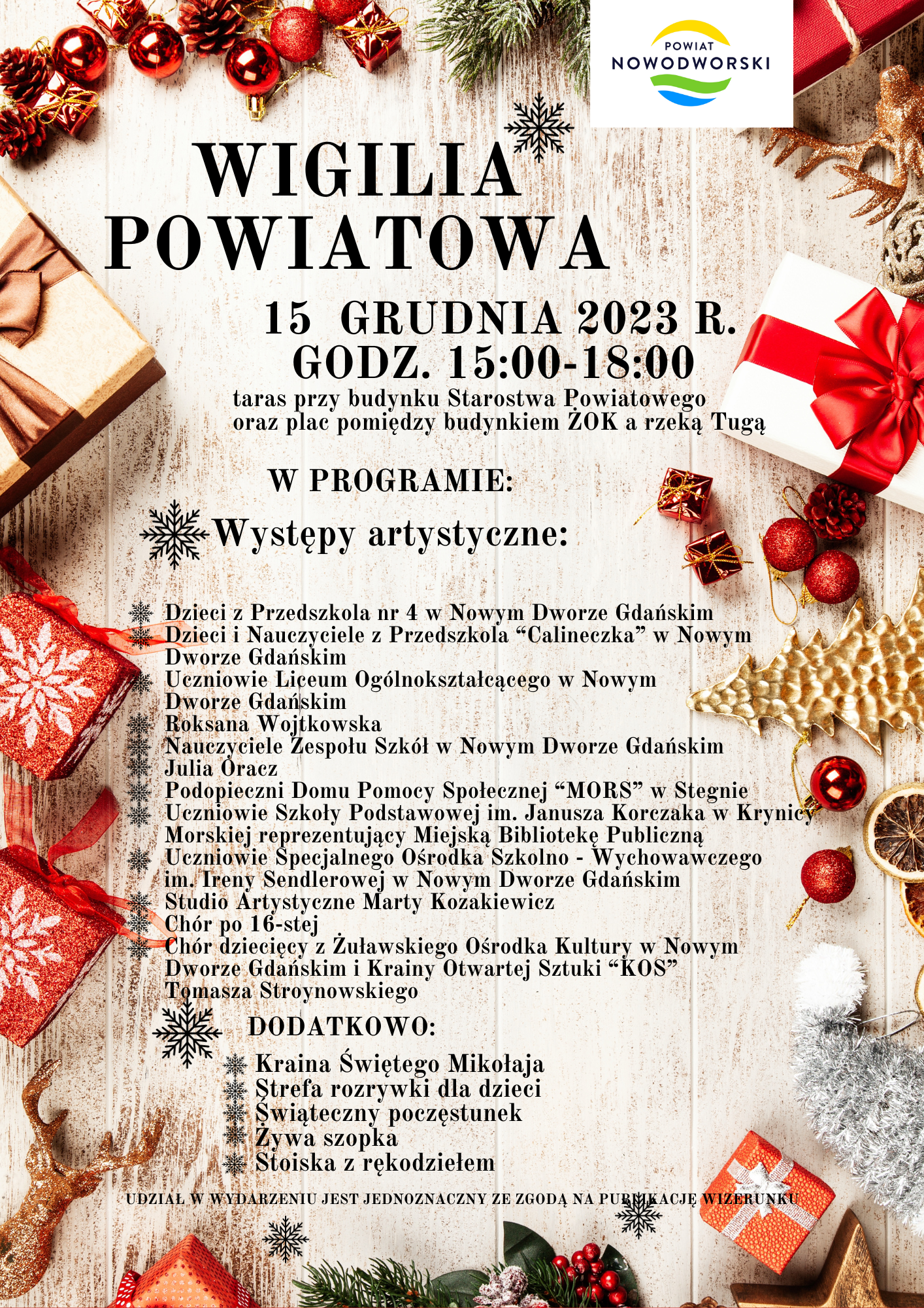 W imieniu Starostwa Powiatowego w Nowym Dworze Gdańskim serdecznie zapraszamy do udziału w Wigilii Powiatowej w dniu 15 grudnia 2023 r. od godz. 15:00 do 18:00