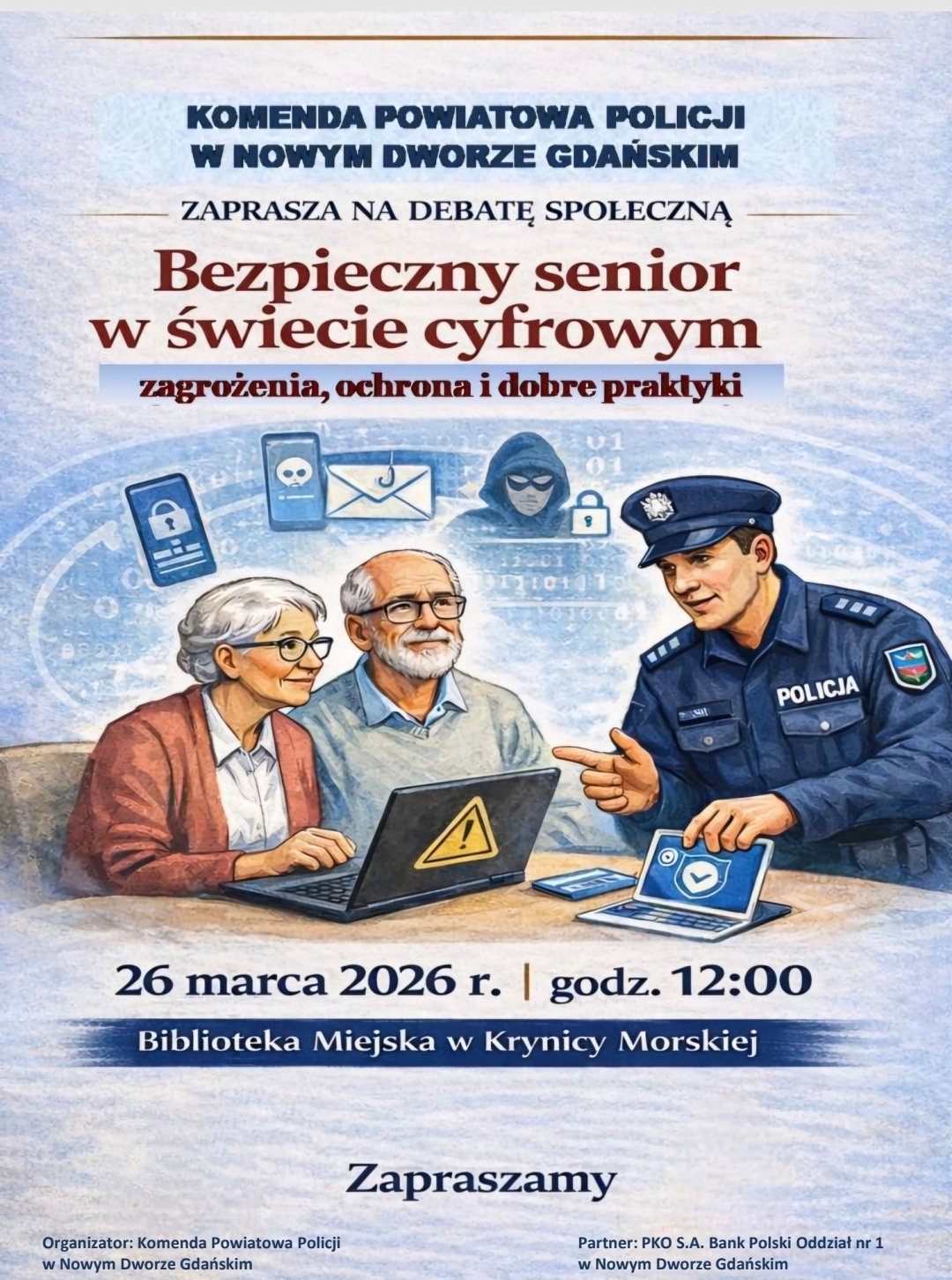 Strona główna » Aktualności » Zaproszenie na debatę społeczną 26.03.2026 Data dodania 16.03.2026 Zaproszenie na debatę społeczną 26.03.2026 Debata społeczna pn. „Bezpieczny senior w świecie cyfrowym” – 26.03.2026 Miejsce: Biblioteka Miejska w Krynicy Morskiej godz. 12:00 Drukuj
