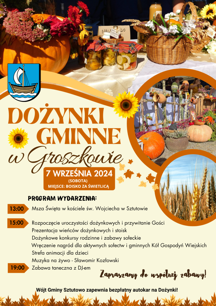 Wójt Gminy Sztutowo Robert Zieliński zaprasza wszystkich mieszkańców oraz gości na Dożynki Gminne, które odbędą się w Groszkowie dnia 7 września 2024 r.![]()
