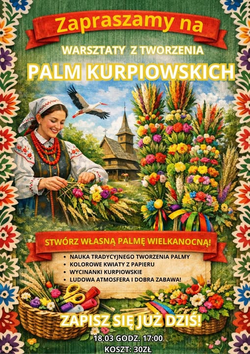 Dowiesz się, jak przygotować elementy palmy oraz jak łączyć materiały i kolory, by uzyskać tradycyjny, bogaty efekt. Z warsztatów wyjdziesz z własnoręcznie wykonaną palmą – barwną i trwałą ozdobą, w której widać kunszt i cierpliwość.