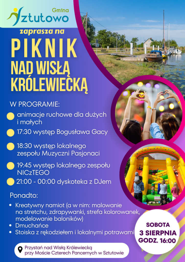 Serdecznie zapraszamy na Piknik nad Wisłą Królewiecką , który odbędzie 3 sierpnia br. na przystani żeglarskiej przy Moście Czterech Pancernych w Sztutowie.