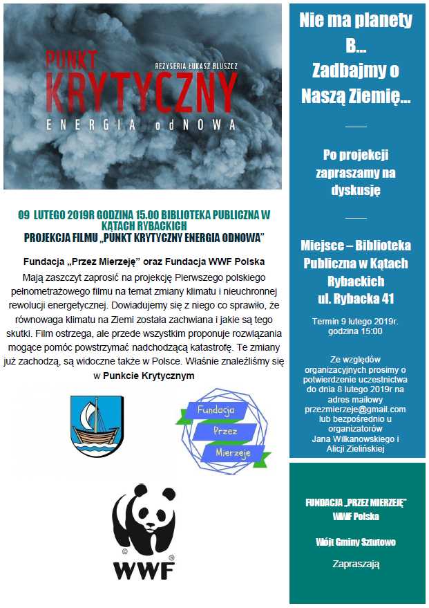 Strona główna » Aktualności » Zaproszenie na projekcję filmu „Punkt krytyczny Energia odNowa” Data dodania 06.02.2019 Zaproszenie na projekcję filmu „Punkt krytyczny Energia odNowa” Drukuj