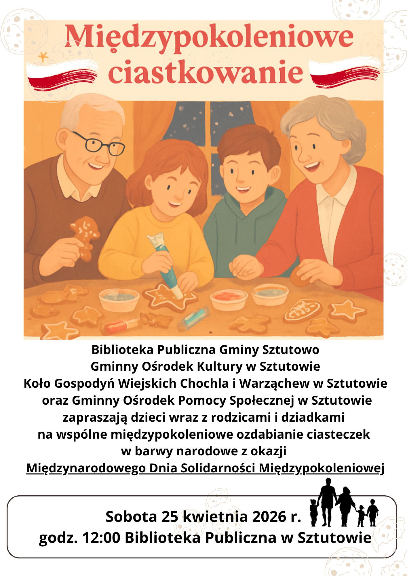 Z okazji Międzynarodowego Dnia Solidarności Międzypokoleniowej w imieniu Biblioteki Publicznej Gminy Sztutowo, Gminnego Ośrodka Pomocy Społecznej, Gminnego Ośrodka Kultury w Sztutowie oraz Koło Gospodyń Wiejskich Chochla i Warząchew w Sztutowie serdecznie zapraszamy na wspólne dekorowanie ciasteczek w barwy narodowe.