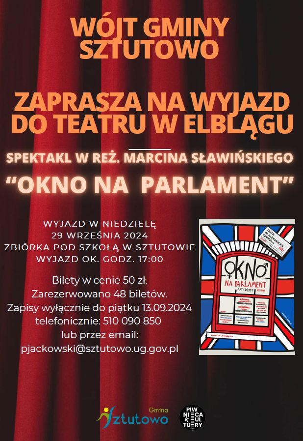 Wójt Gminy Sztutowo, Pan Robert Zieliński, zaprasza na wyjazd do teatru w Elblągu na spektakl pt. „Okno na Parlament”.