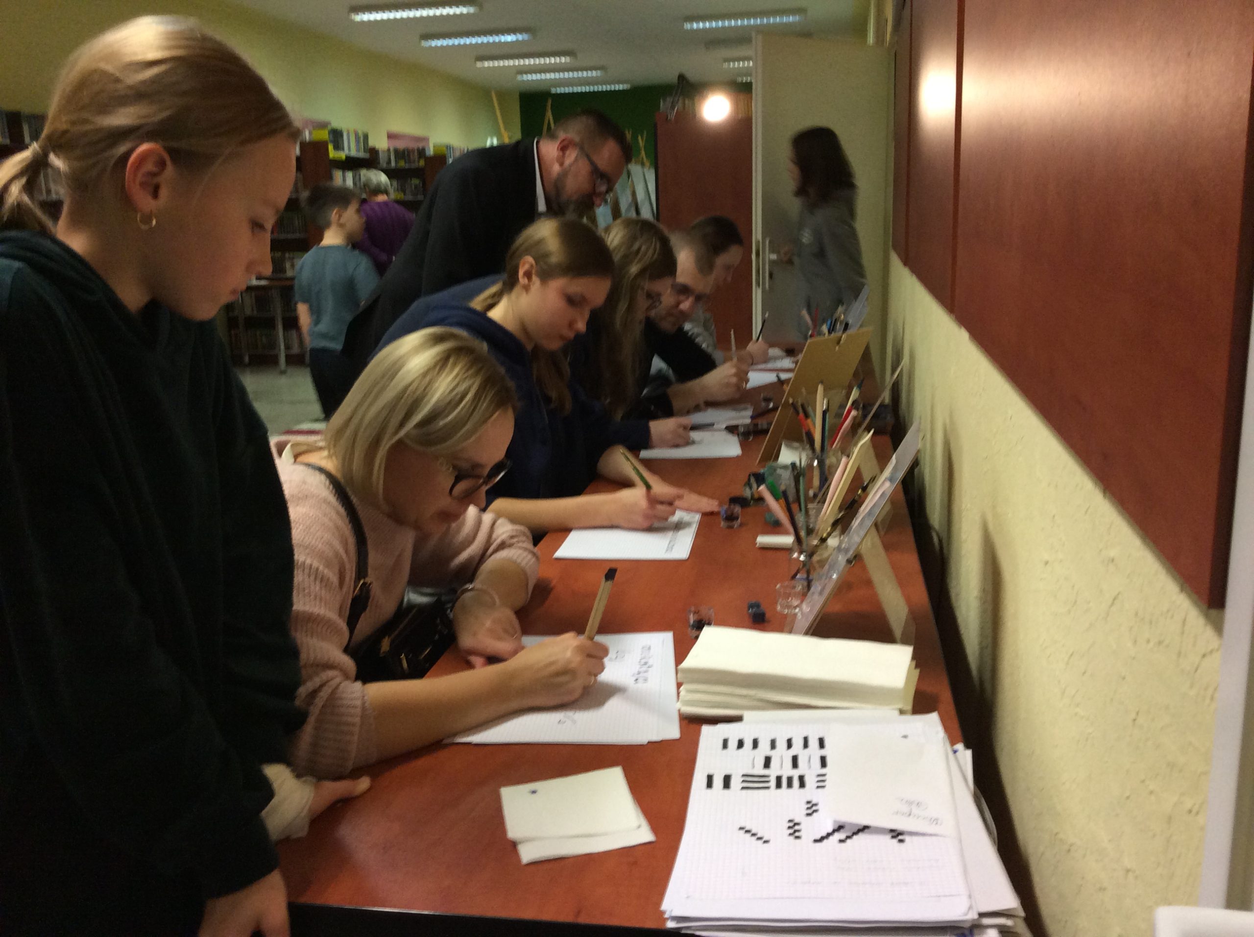 Miejscem zajęć była sztutowska biblioteka, w której przez miesiąc pod fachową opieką Pani Aleksandry Kwiatkowskiej-Kasprzak, poznawali tajniki kaligrafii młodzi adepci tej sztuki.