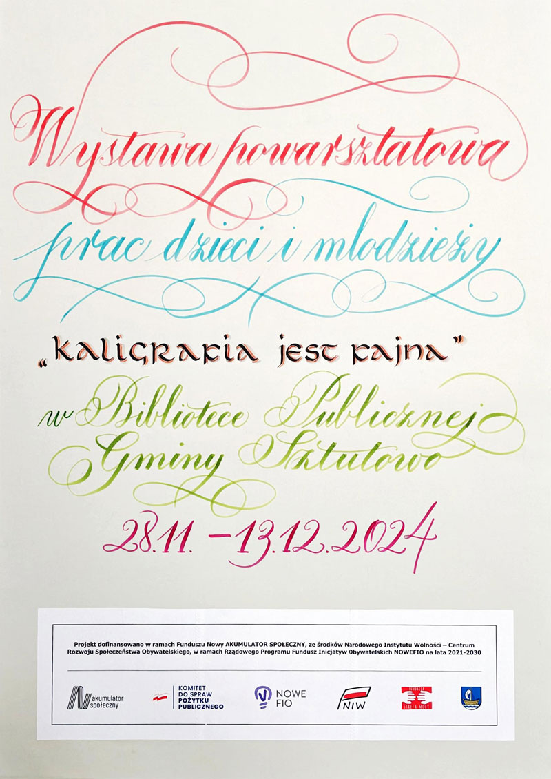 Serdecznie zapraszamy na wystawę powarsztatową prac dzieci i młodzieży „Kaligrafia jest fajna” w Bibliotece Publicznej Gminy Sztutowo w terminie 28.11-13.12.2024 r.