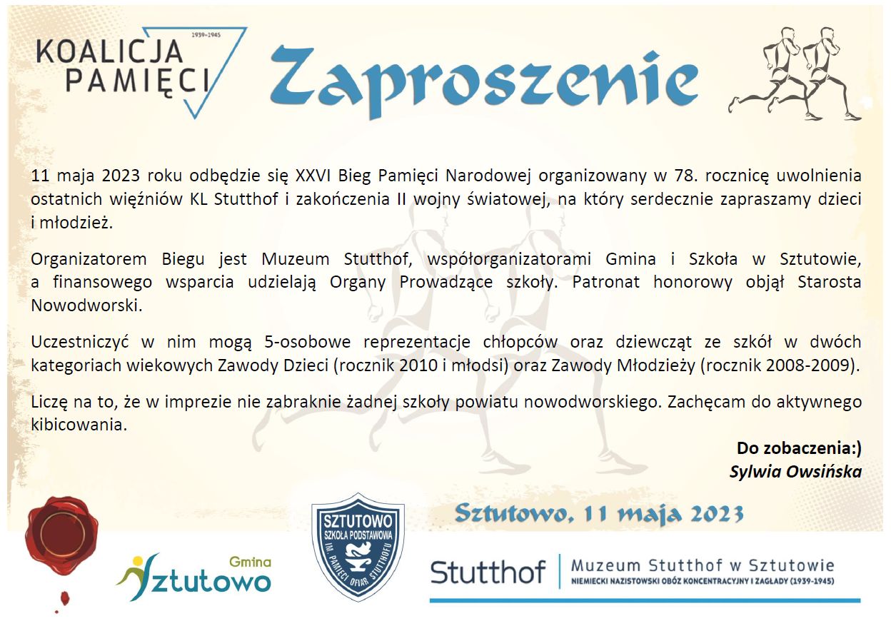 Strona główna » Aktualności » Zaproszenie na XXVI Bieg Pamięci Narodowej – 11 maja 2023 Data dodania 21.04.2023 Zaproszenie na XXVI Bieg Pamięci Narodowej – 11 maja 2023 Drukuj
