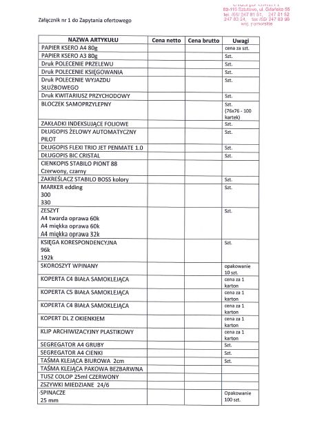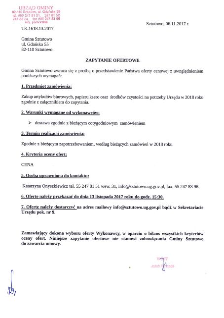 Strona główna » Aktualności » Zapytanie ofertowe – zakup artykułów biurowych, papieru ksero oraz środków czystości na potrzeby Urzędu Data dodania 06.11.2017 Zapytanie ofertowe – zakup artykułów biurowych, papieru ksero oraz środków czystości na potrzeby Urzędu Gmina Sztutowo zwraca się z prośbą o przedstawienie Państwa oferty cenowej z uwzględnieniem poniższych wymagań: Jednocześnie zwracamy się z prośbą o podanie terminu oczekiwania na realizację zamówienia. Drukuj