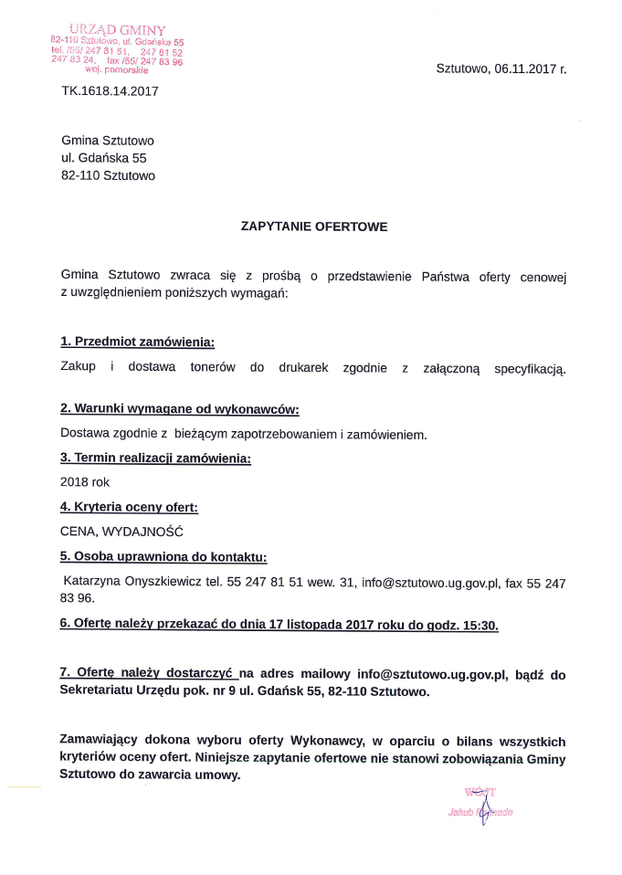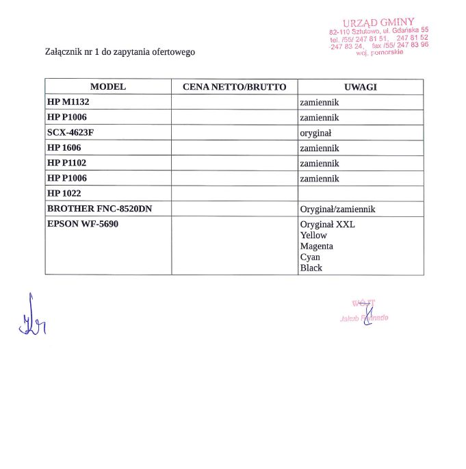 Strona główna » Aktualności » Zapytanie ofertowe – zakup i dostawa tonerów Data dodania 06.11.2017 Zapytanie ofertowe – zakup i dostawa tonerów Gmina Sztutowo zwraca się z prośbą o przedstawienie Państwa oferty cenowej dotyczącej zakupu i dostawy tonerów do drukarek zgodnie z załączoną specyfikacją. Jednocześnie zwracamy się z prośbą o podanie terminu oczekiwania na realizację zamówienia. Drukuj