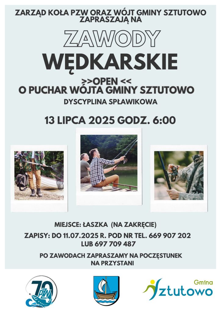 W imieniu Koła PZW w Sztutowie oraz Wójta Gminy Sztutowo Roberta Zielińskiego serdecznie zapraszamy miłośników wędkowania do zapisów na Zawody Wędkarskie o Puchar Wójta Gminy Sztutowo, które odbędą się w dniu 14.07.2024 r. w Łaszce.