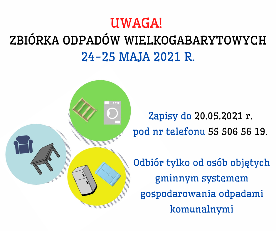 W celu usprawnienia procesu odbioru odpadów prosimy o telefoniczne zapisy do dnia 20.05.2021 r. pod nr telefonu 55 506 56 19.