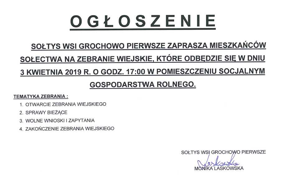 Strona główna » Aktualności » Zebranie wiejskie sołectwa Grochowo Pierwsze – 03.04.2019 r. Data dodania 28.03.2019 Zebranie wiejskie sołectwa Grochowo Pierwsze – 03.04.2019 r. Drukuj