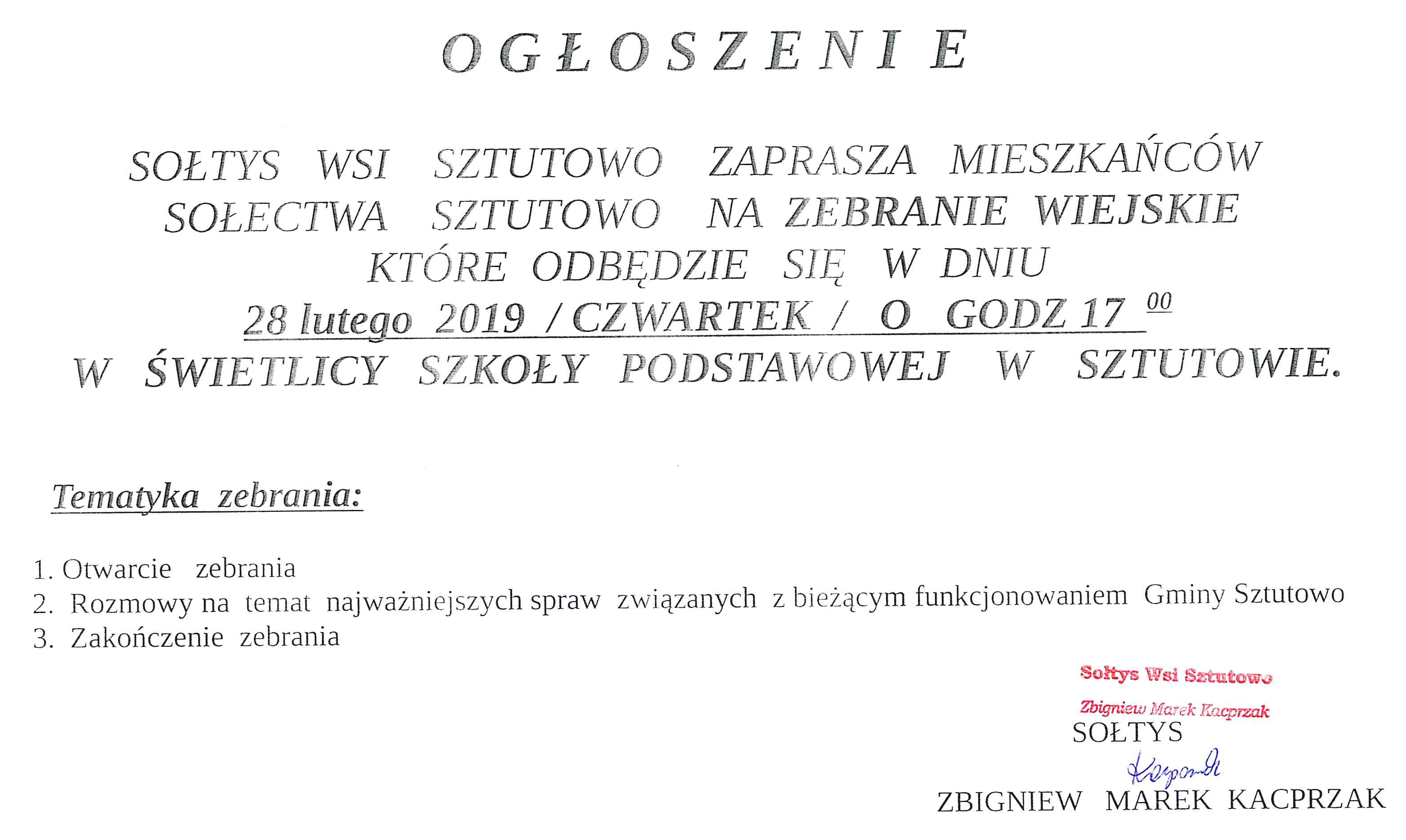Strona główna » Aktualności » Zebranie wiejskie Sołectwa Sztutowo 28.02.2019 Data dodania 07.02.2019 Zebranie wiejskie Sołectwa Sztutowo 28.02.2019 Drukuj