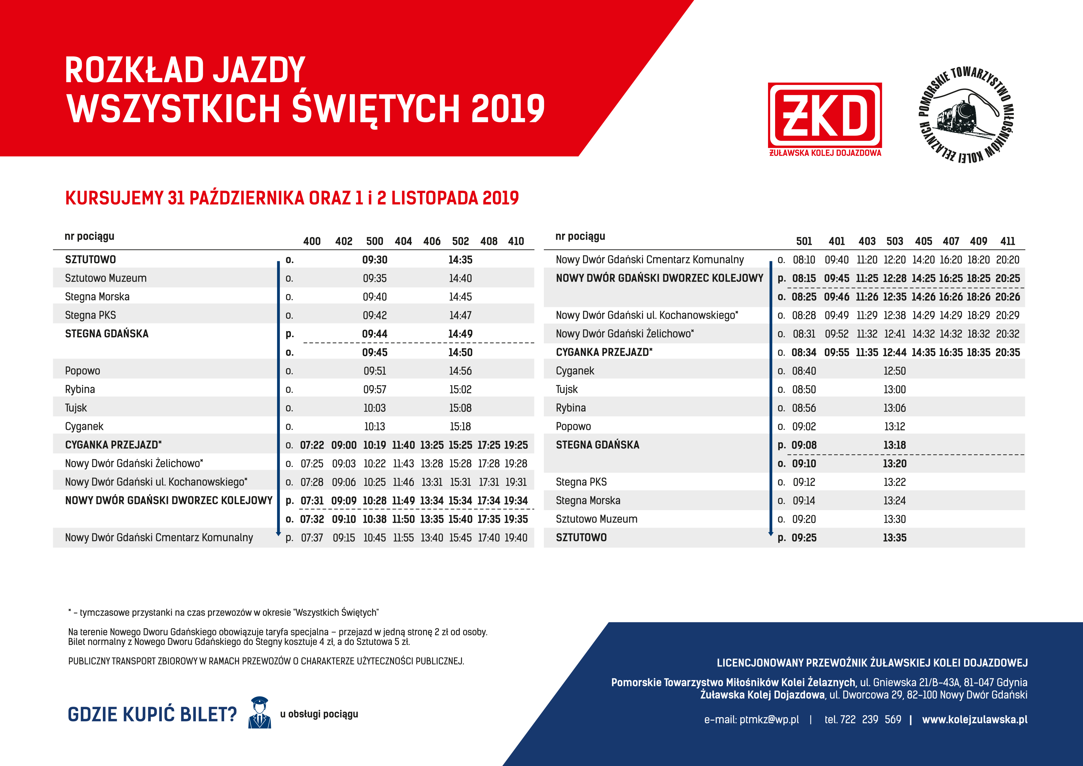 Dodatkowo, w dniach 31 października, 1 listopada i 2 listopada wyjadą na szlak pociągi do Sztutowa, Stegny, Rybiny i Tujska co umożliwi odwiedziny na grobach bliskich także mieszkańcom tych miejscowości.