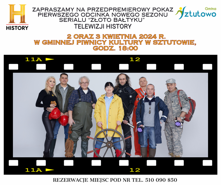 Strona główna » Aktualności » „Złoto Bałtyku” -przedpremierowy pokaz w Gminnej Piwnicy Kultury Data dodania 26.03.2024 „Złoto Bałtyku” -przedpremierowy pokaz w Gminnej Piwnicy Kultury Serdecznie zapraszamy na przedpremierowy pokaz I odcinka nowego sezonu serialu „Złoto Bałtyku” TV HISTORY już 2 i 3 kwietnia w Gminnej Piwnicy Kultury w Sztutowie. Start godz. 18:00 Drukuj