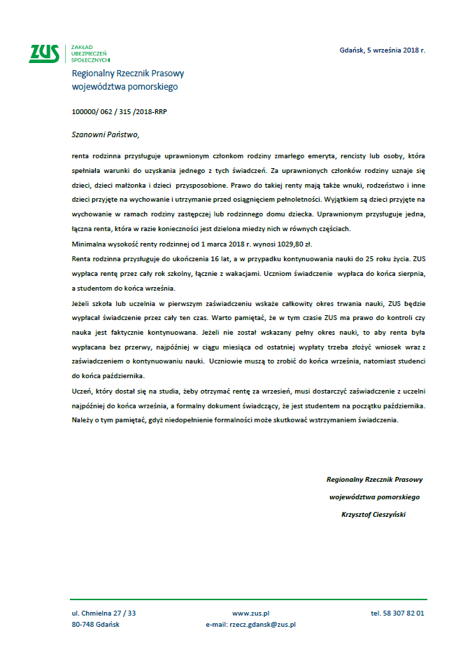 Strona główna » Aktualności » ZUS przypomina o zaświadczeniach do renty rodzinnej Data dodania 05.09.2018 ZUS przypomina o zaświadczeniach do renty rodzinnej Drukuj