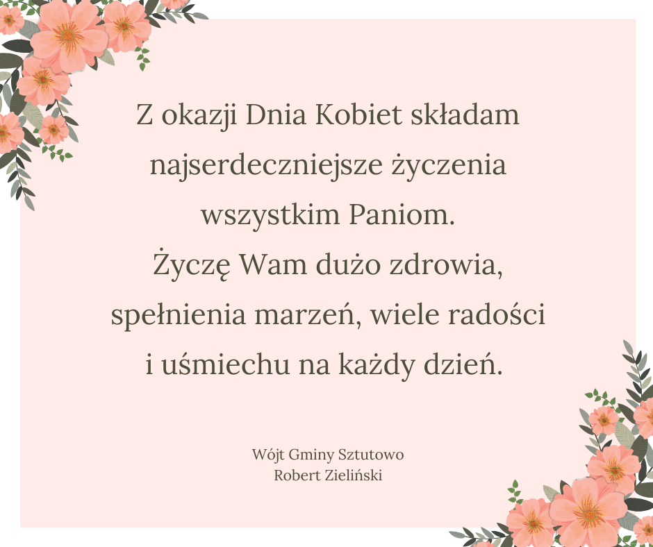 Strona główna » Aktualności » Życzenia na Dzień Kobiet Data dodania 08.03.2021 Życzenia na Dzień Kobiet Z okazji Dnia Kobiet składam najserdeczniejsze życzenia wszystkim Paniom. Życzę Wam dużo zdrowia, spełnienia marzeń, wiele radości i uśmiechu na każdy dzień. Wójt Gminy Sztutowo Rober Zieliński Drukuj
