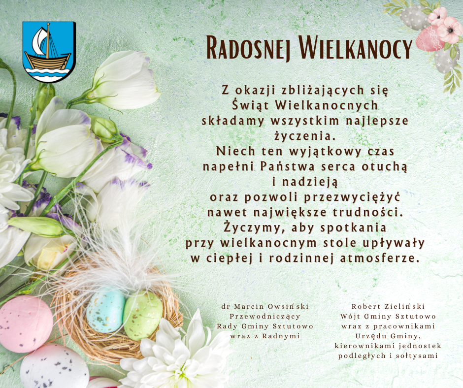 Strona główna » Aktualności » Życzenia Wielkanocne Data dodania 29.03.2024 Życzenia Wielkanocne Wszystkim Partnerom, Pracownikom, Przyjaciołom oraz Mieszkańcom Gminy Sztutowo życzymy zdrowych, spokojnych i rodzinnych Świąt Wielkanocnych. Radosnego Alleluja! Drukuj
