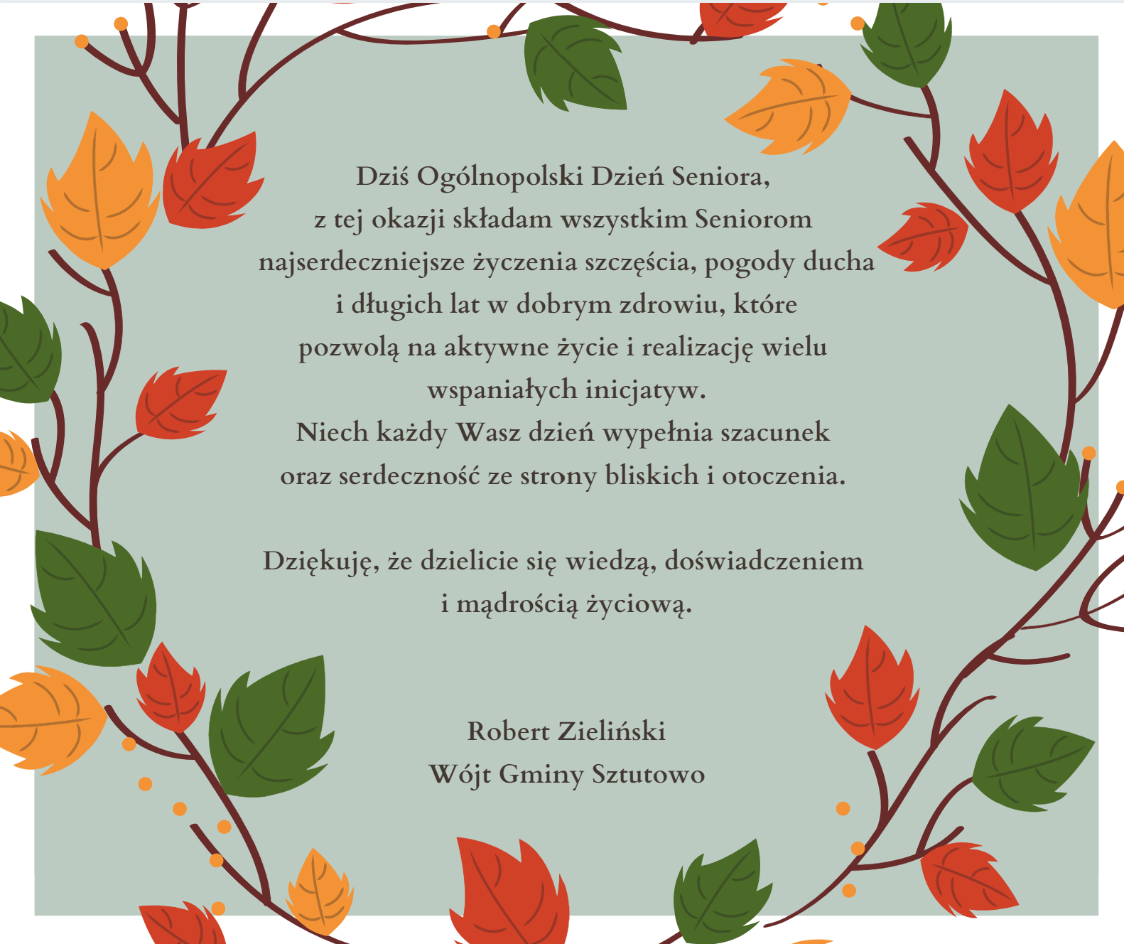Strona główna » Aktualności » Życzenia z okazji Ogólnopolskiego Dnia Seniora Data dodania 14.11.2020 Życzenia z okazji Ogólnopolskiego Dnia Seniora Drukuj